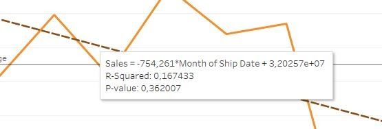 Por el lado de las funciones estadísticas, estas herramientas no se quedan atrás, la gran mayoría tiene integradas funciones estadísticas, como sacar sumatoria, promedio, diferencia entre datos, convertir datos a porcentaje, diferencia entre porcentajes, desviación estándar, varianza, porcentajes, entre muchas otras, la herramienta de tableau por ejemplo permite analizar líneas de tendencia mostrando el valor de r cuadrado y el p valor, como se observa en la siguiente ilustración.