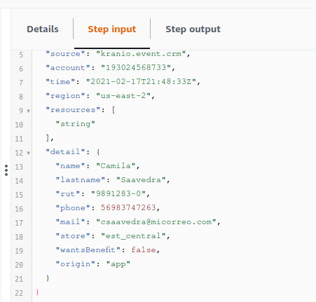 Donde al elegir el paso ReceiveLead, el input corresponde al payload enviado como evento vía Event Bridge.