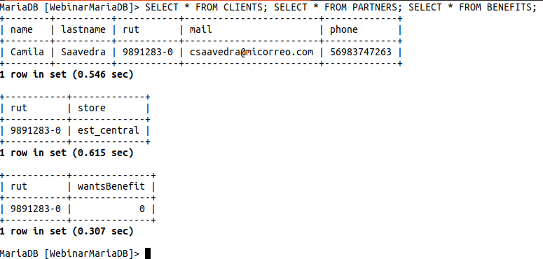 Si ingresas a tu base de datos (ya sea con el cliente de la terminal o con un cliente visual intuitivo) verás que cada dato está en cada una de las tablas correspondientes.