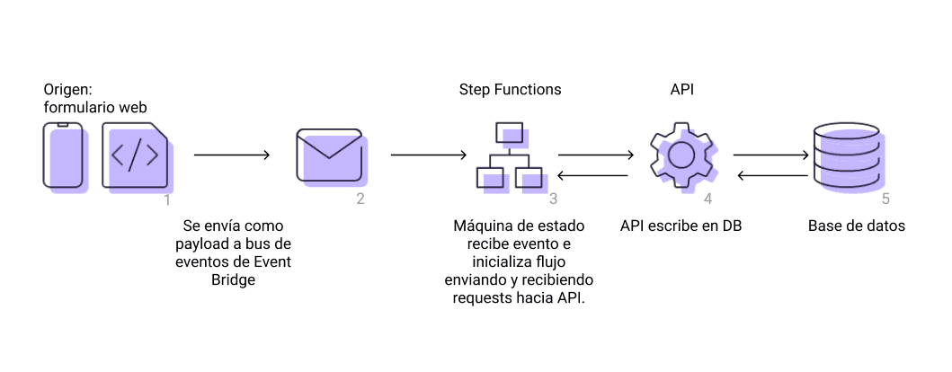 Suponiendo que estamos trabajando en el CRM de tu empresa, y que los datos iniciales los estás obteniendo de un formulario web, la manera de escribir en el bus de eventos que inicializará el flujo es a través del SDK de AWS. Conoce los lenguajes para los que está disponible aquí