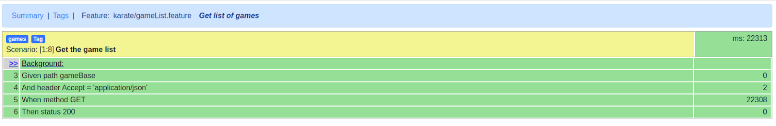 Este escenario hace una llamada GET al servicio que entrega la lista de juegos y valida que la información se despliega correctamente.
