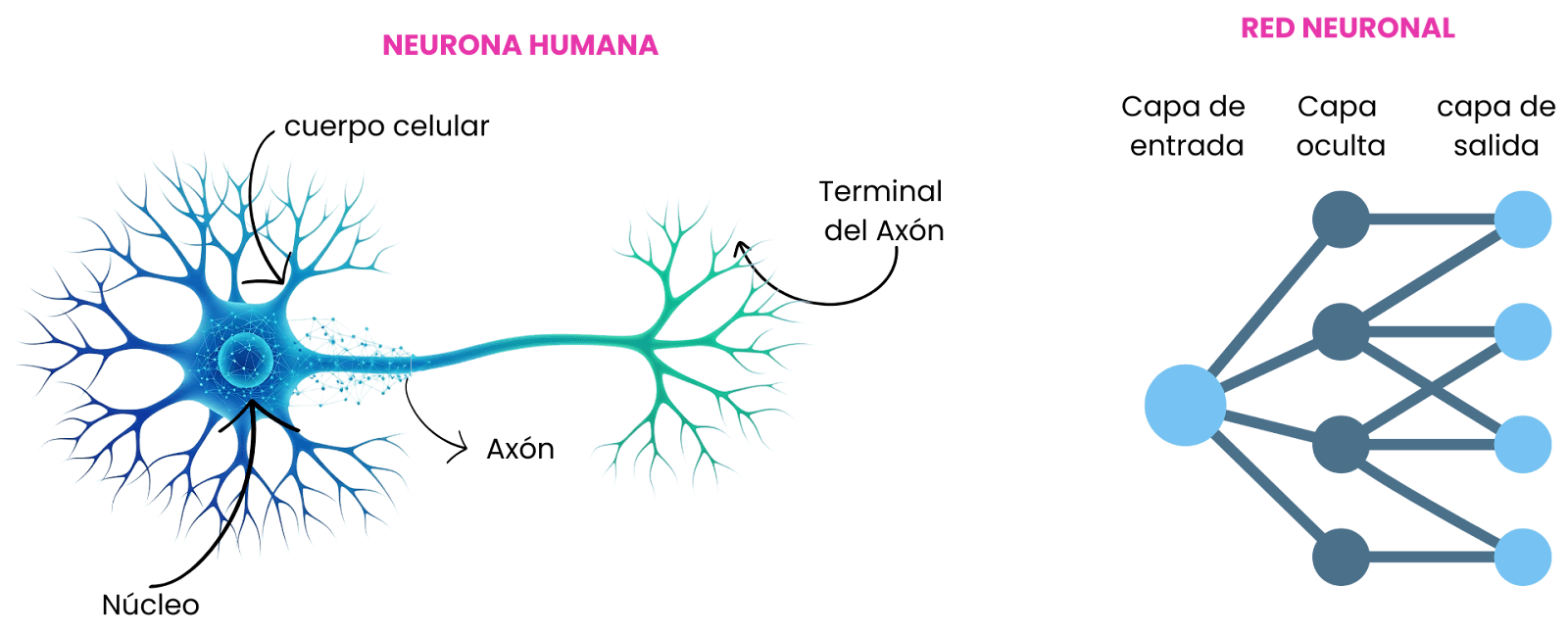 En una neurona humana una señal entra en el cuerpo celular que luego genera una respuesta la cual es emitida a través de las terminales del axón hacia otras neuronas. En una red neuronal existe un componente llamado perceptrón, éste es el equivalente a una neurona. Está estructurado por una capa de entrada, una o más capas ocultas y una capa de salida. La capa de entrada recibe la señal, en las capas ocultas es donde se procesan los algoritmos para finalmente generar una respuesta en la capa de salida.