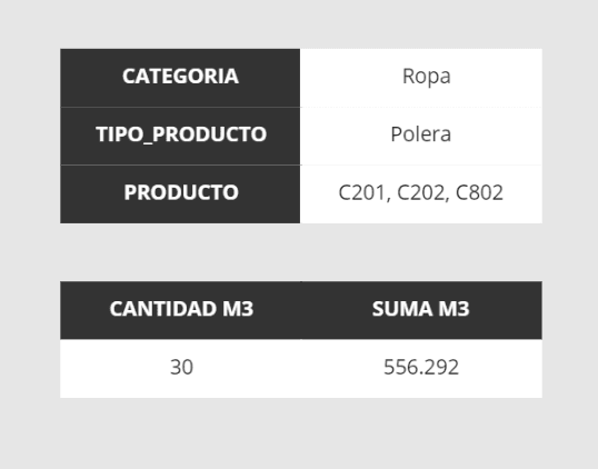 |CATEGORIA | TIPO_PRODUCTO| sum(m3)|