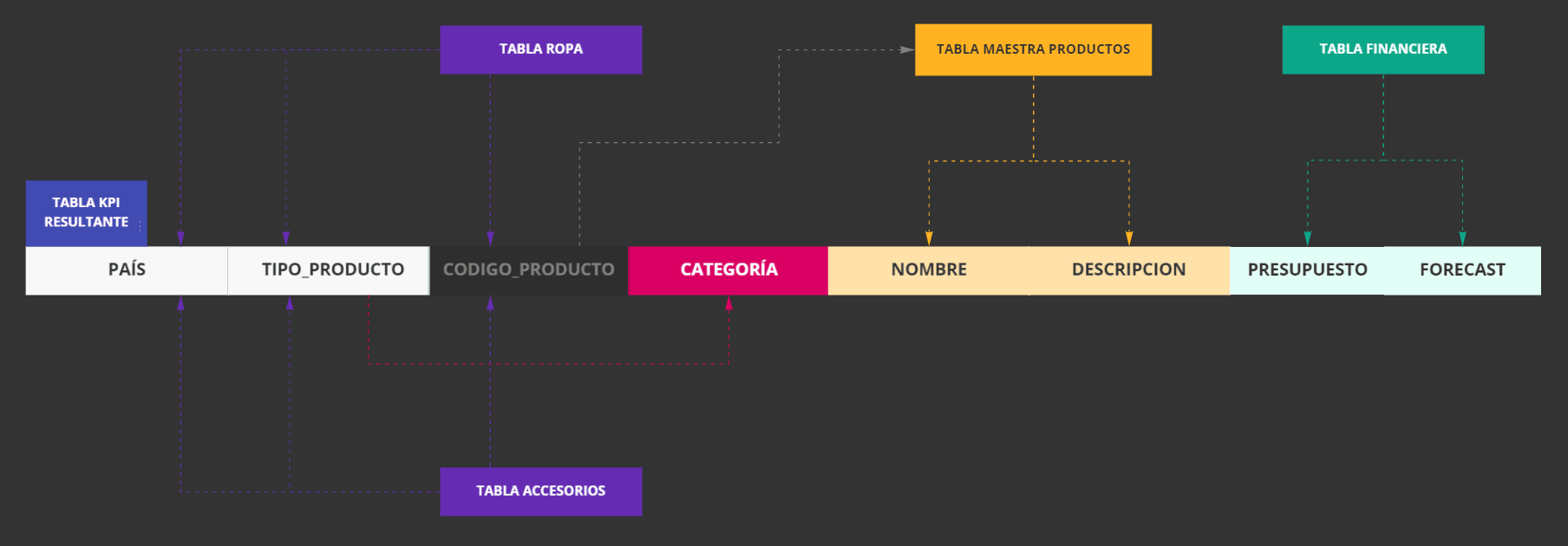 Lo que hicimos fue tomar dos fuentes de datos que compartían características, venta_ropa.csv y venta_accesorios.csv, realizamos procesos de estandarización (Script de corrección de datos), obtuvimos nuevas columnas al relacionar una columna del archivo original con la fuente maestra (Script de relaciones maestras) y mediante un proceso de filtrado generamos una nueva columna al hacer coincidir una condición (Script de filtrado). Adicionalmente podríamos tomar las referencias aprendidas y realizar cálculos más complejos para por ejemplo, utilizar la tabla transaccional de costos_margen.csv y de esta manera obtener los valores de Forecast.