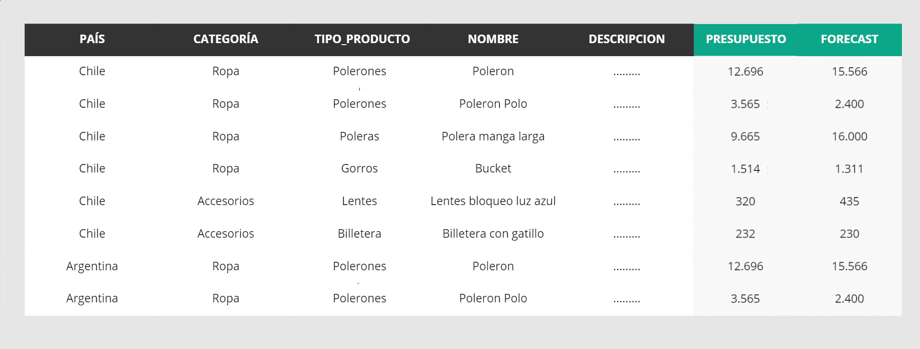 El reporte resultante simula los datos de una empresa distribuidora de distintos productos, podemos ver que es un reporte que posee información concentrada de los resultados obtenidos con algunos productos, además del cálculo del presupuesto y Forecast para cada uno. Esta es la tabla resultado y para llegar a ella deberemos realizar transformaciones sobre distintas fuentes, específicamente una serie de datos transaccionales y maestros.