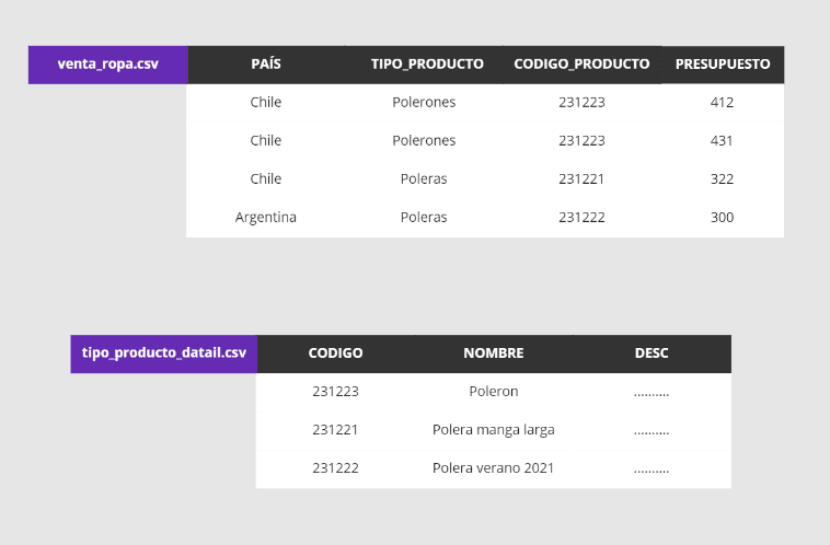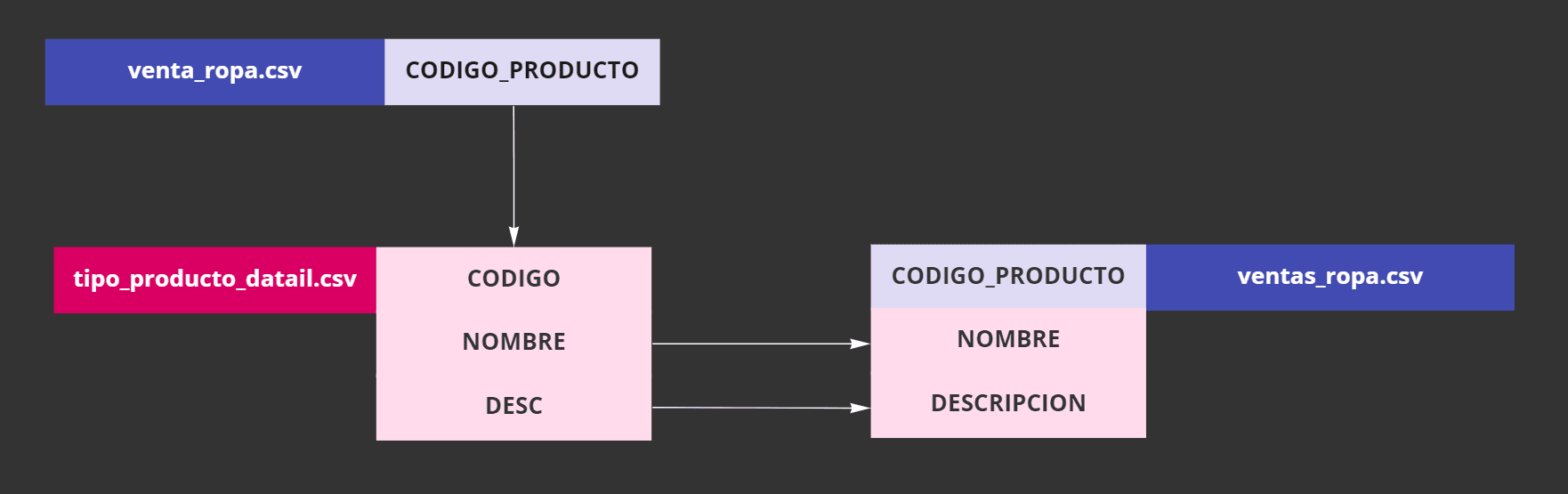 tipo_producto_detail.csv el cual posee los valores descriptivos utilizados para construir dos de las columnas del reporte final.Los valores transaccionales como venta_ropa.csv tienen una columna denominada codigo_producto la cual al relacionarla con la columna codigo del archivo maestro tipo_producto_detail.csv permite obtener el nombre código de producto y la descripción del producto que renombraremos descripcion. El resultado es que conseguimos agregar dos columnas adicionales a ventas_ropa.csv al relacionarse con el archivo maestro, tal y como se muestra en la siguiente imagen: