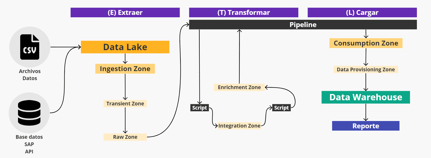 ETL son las siglas de Extract, Transform y Load. ETL es un proceso que extrae información de distintas fuentes de datos hacia un Data Lake, transforma los datos en una ruta o zona y finalmente los carga en un Data Warehouse para que sean consumidos.