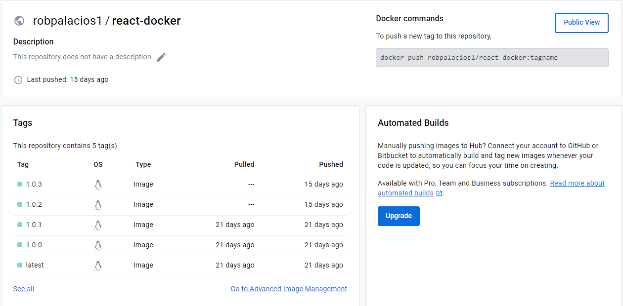 💡Nota: Como pueden ver, tengo en mi Docker Hub un repositorio de React con diferentes versiones que he hecho en el código, y solo con hacer un pull a su local pueden aportar al código, estilo GitHub con el comando docker pull robpalacios1/react-docker:<Tag>